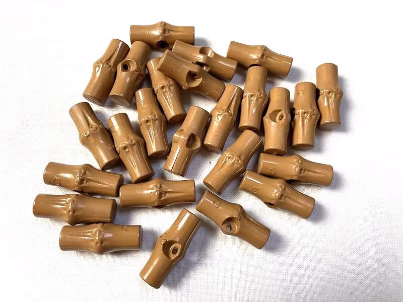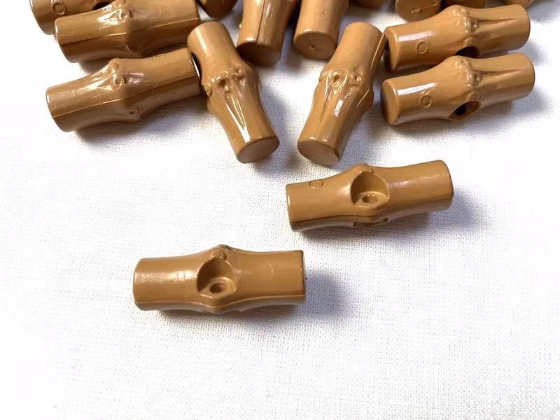 En duffelknapp i brun plast.