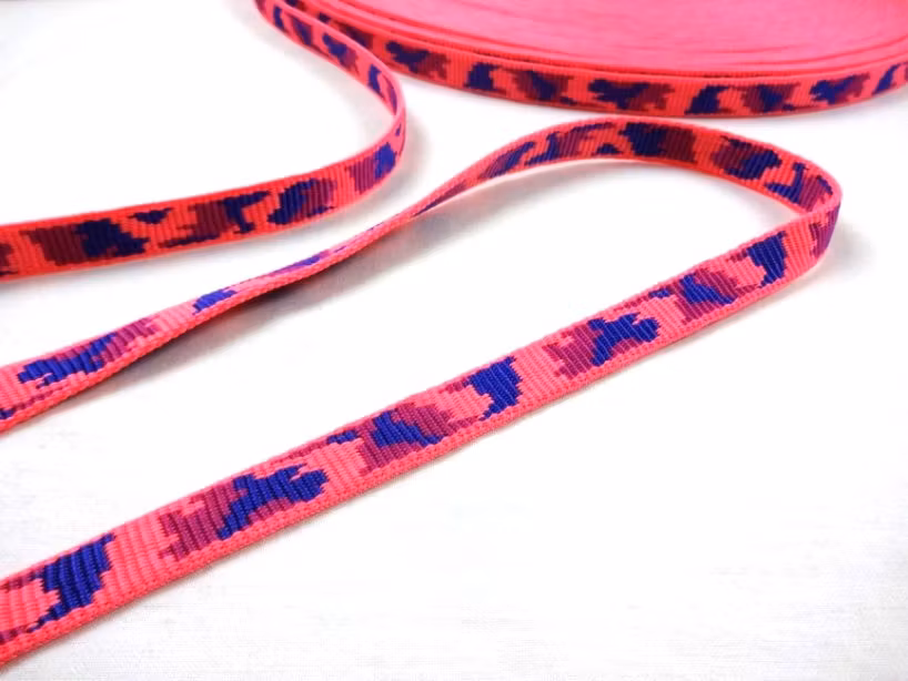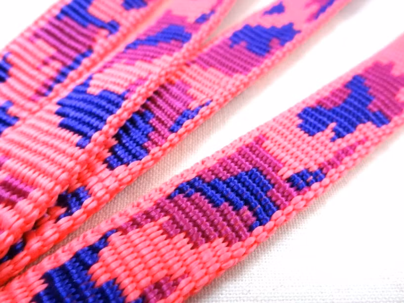 Ett vädertåligt, hållbart och starkt polypropylenband med rosa kamouflagemönster på båda sidor.