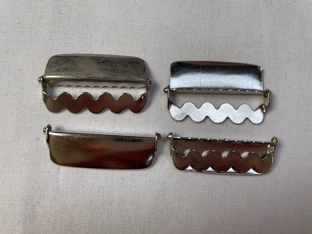 Ett enkelt spänne i silverfärgad metall, där du kan justera band, resår och hängslens längd .